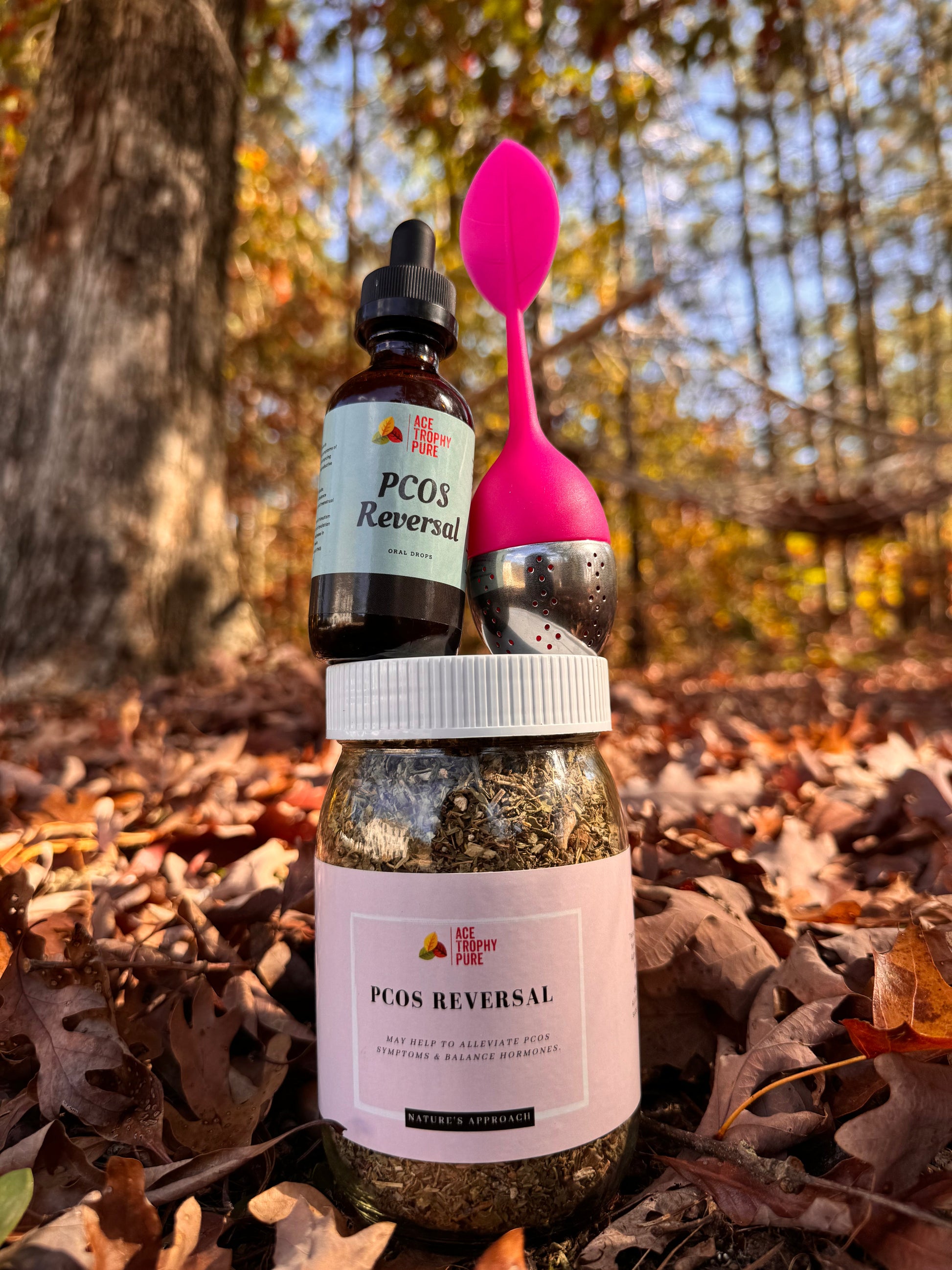 The PCOS KIT is designed to target the underlying imbalances that lead to PCOS. It includes a Melt Down Tea, PCOS Reversal Tea, PCOS Reversal Drops, Maca Root, Hormonal Tea Blend, and a Tea Infuser for convenience.
